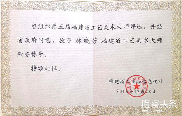 林曉芳,1981年生于德化陶瓷彩繪世家,至此已傳承八代。自幼追隨祖父——知名藝人林質(zhì)彬?qū)W習繪畫技藝,畢業(yè)于泉州工藝美術職業(yè)學院,2017年進修于景德鎮(zhèn)學院國家藝術基金高研班。現(xiàn)為國家一級技師、全國青年崗位能手、福建省工藝美術大師、福建省陶瓷藝術名人、泉州市優(yōu)秀青年拔尖人才、泉州市青年五四獎章,德化縣肅雅堂陶瓷研究所負責人。
