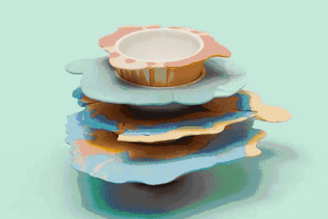它們最終的結(jié)果由染色泥漿不可預(yù)測的自發(fā)運動和燒造時的條件決定,染過色的原料隨意傾倒在周邊,形成隨機的邊緣,最后燒制完成的每個作品都獨一無二。這個 Liquid 系列不僅可以作為瓷器餐具來使用,它們還可以堆疊出無盡的變化,創(chuàng)造出獨特的、圖形化的組合效果。