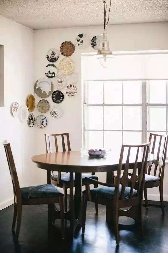 用盤子代替原本的照片或者畫,掛在簡單素凈的墻上,通過盤子本身顏色、形狀的搭配,可以給整個室內效果帶來更大的突破。
