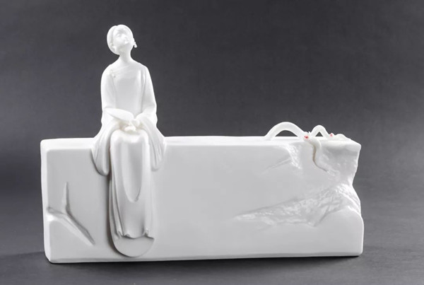 一彎清月攜著幾縷卷云,一片碩大荷葉上的幾朵出水芙蓉,都靜謐地鑲嵌在一顆光滑圓潤(rùn)的巨石上,端坐在石上的仕女輕撫著懷中的古琴,細(xì)膩柔美的衣褶輕輕飄蕩,“琴寄愁思于風(fēng),荷映倩影于月”,這是陳建陽(yáng)的白瓷作品《荷塘月色》展現(xiàn)給觀眾的美好畫(huà)面。他堅(jiān)信“藝術(shù)源自于生活”,這件作品的靈感便來(lái)自一次山間游玩所遇見(jiàn)的鵝卵石。光潔如玉的卵石,映于其上的月影和荷花,都給人以無(wú)限遐想和詩(shī)意。