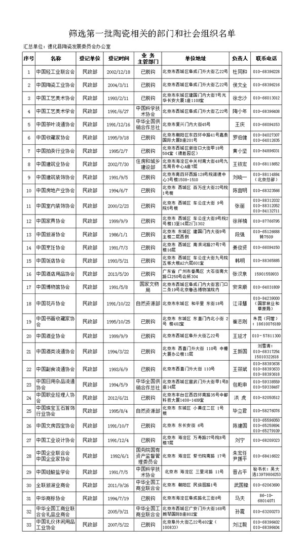 為更好地服務(wù)德化縣陶瓷產(chǎn)業(yè)發(fā)展,進(jìn)一步拓寬德化陶瓷銷售渠道,德化縣陶瓷辦篩選出部分與陶瓷有關(guān)部門和社會(huì)組織名單,方便企業(yè)及個(gè)人對(duì)接。