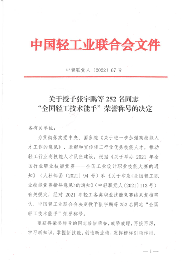 “全國輕工技術能手”榮譽光榮榜