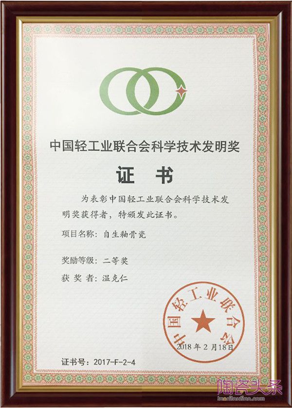 2017年,“自生釉骨瓷”技術在眾多高新技術產業中脫穎而出,榮獲“中國輕工業聯合會科學技術發明二等獎”,標志著自生釉骨瓷技術的技術創新以及在多領域的應用獲得高度認可。