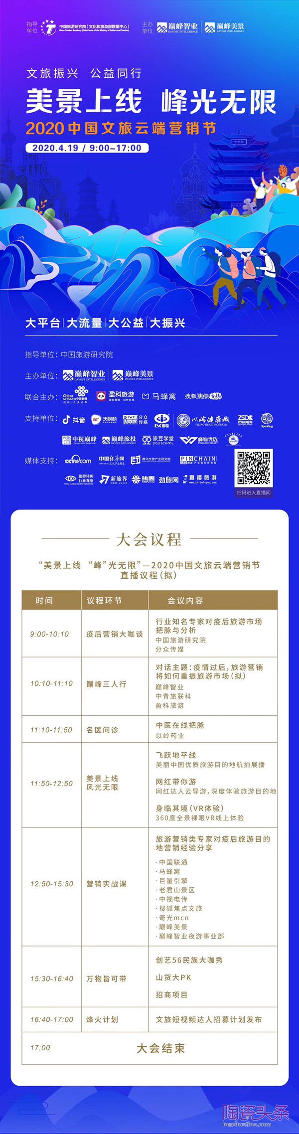 由中國旅游研究院指導,巔峰智業、巔峰美景主辦的“美景上線,‘峰’光無限”——2020中國文旅云端營銷節將于4月19日9:00-17:00開啟。