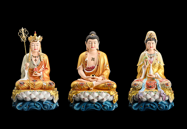 周崇樞的佛教作品主要以現代輕奢家居風格為主,莊嚴又不失親和,現代又不失古雅。顏色使用大膽,黃、紅、綠、藍、橙、紫等色系的應用打破了傳統佛像的視覺審美,用色濃淡相兼,既不艷麗,也不清淡。周崇樞介紹道:“作品都是采用進口的高溫礦物彩顏料,在繪制之前需要進行顏色調配,每上一道色就需要進窯燒制一次,才能進入下一道顏色的繪制,一件成品需要歷經4-5次的燒制。”