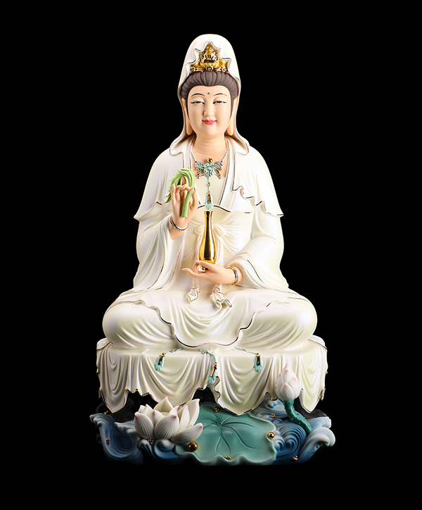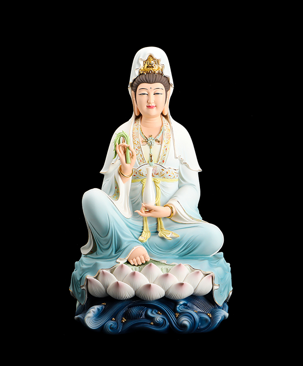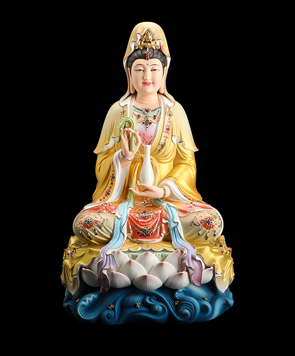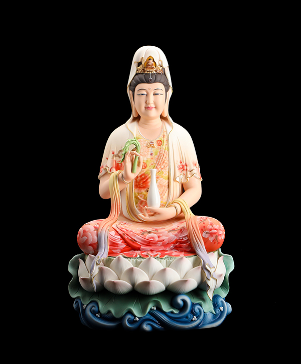 他的觀音手持凈瓶,面相四方,慈眉善目端坐于蓮花寶座上。紅與黃交織在一起的清雅色系搭配,純手工繪制的蓮花點綴于衣裳,描金的瓔珞上鑲嵌著鉆石,盡顯雍容華貴。而立體的蓮花座與海浪設計,特別是垂落于蓮花座上的衣裳,隱約可見花瓣的紋理,讓作品更顯完美。