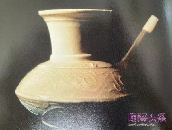 (Figure 4: Kendi, whitsh stoneware with relief scrollwork.14 century. 圖4:軍持,白色粗陶器帶漩渦形浮雕裝飾,14世紀。)